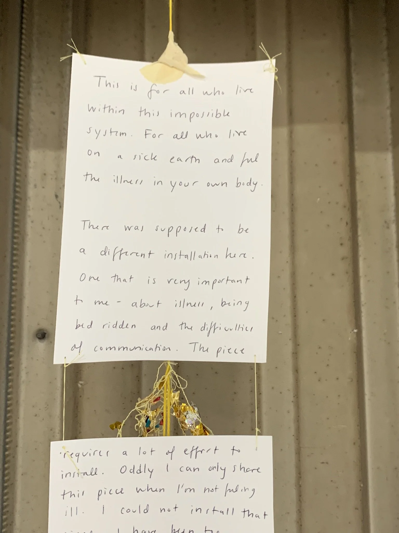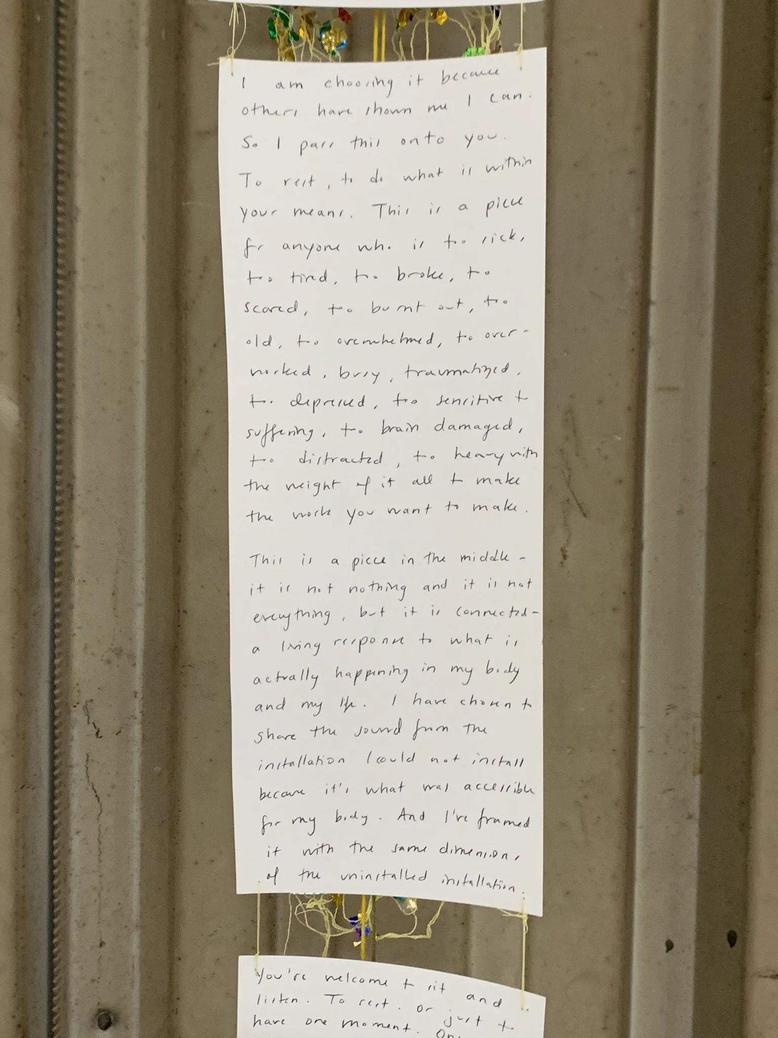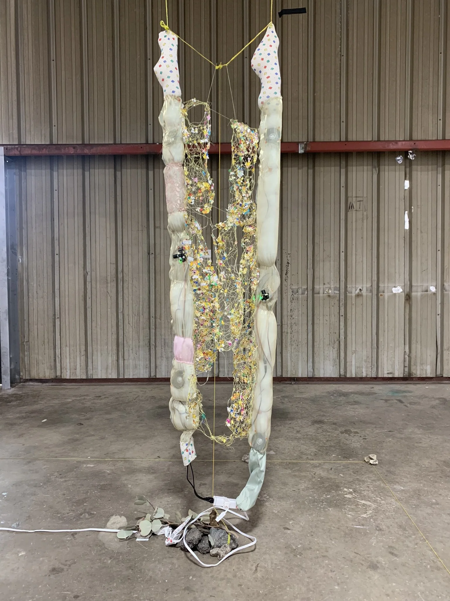 speakers, found rocks, yarn, fabric, thread, confetti, paper